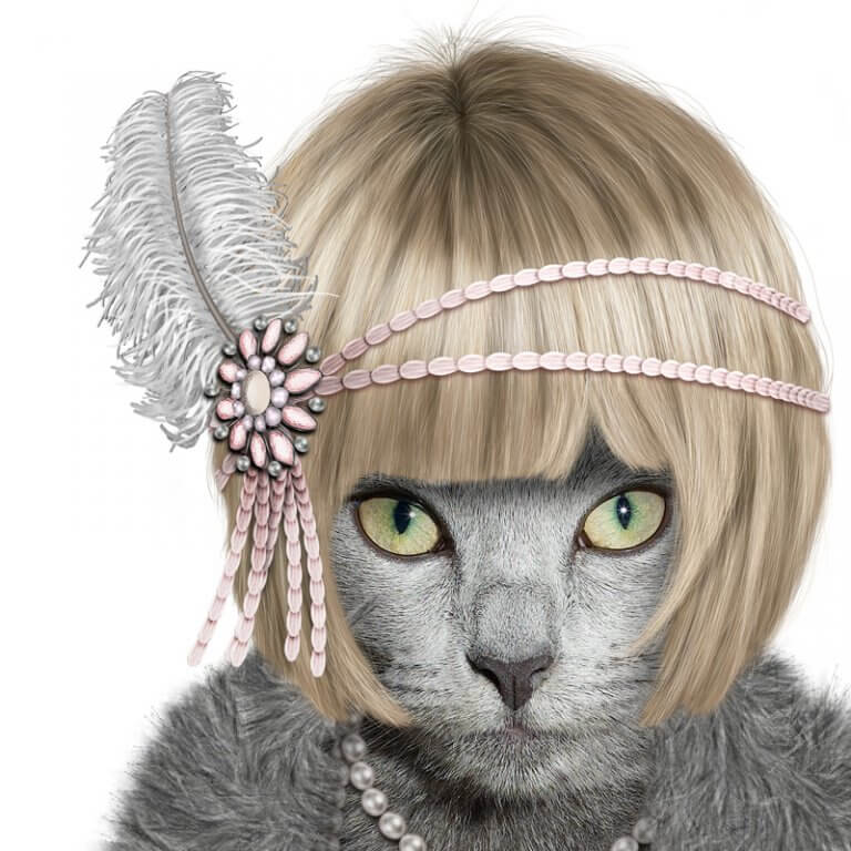 Our daughter was studying The Great Gatsby at school, so we were inspired to create this character. The model was an incredibly sweet little Russian Blue cat.